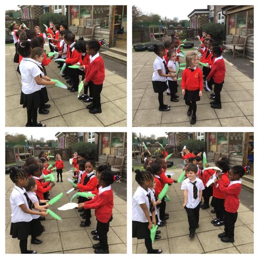 We then reenacted the Palm Sunday scene with children waving their palm leaves and shouting praises to Jesus, this has helped us with our recall of the story. We also learned the hymn 'Sing Hosanna' and sang this as part of our role play lesson. The children showed brilliant Reciprocity, one of our learning powers, working together to create the scene!