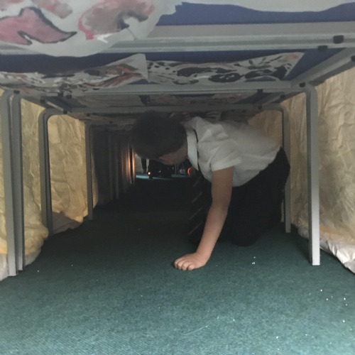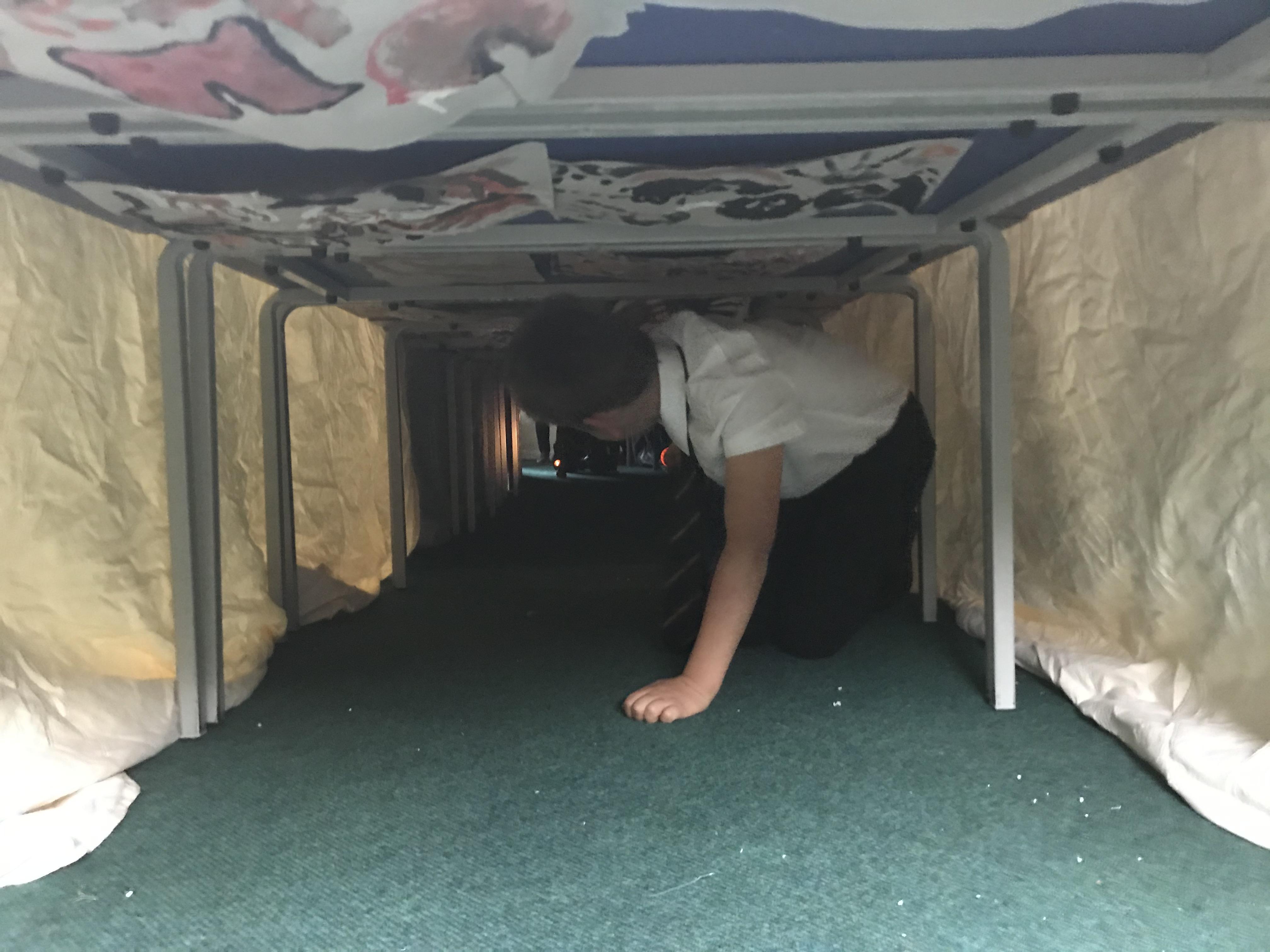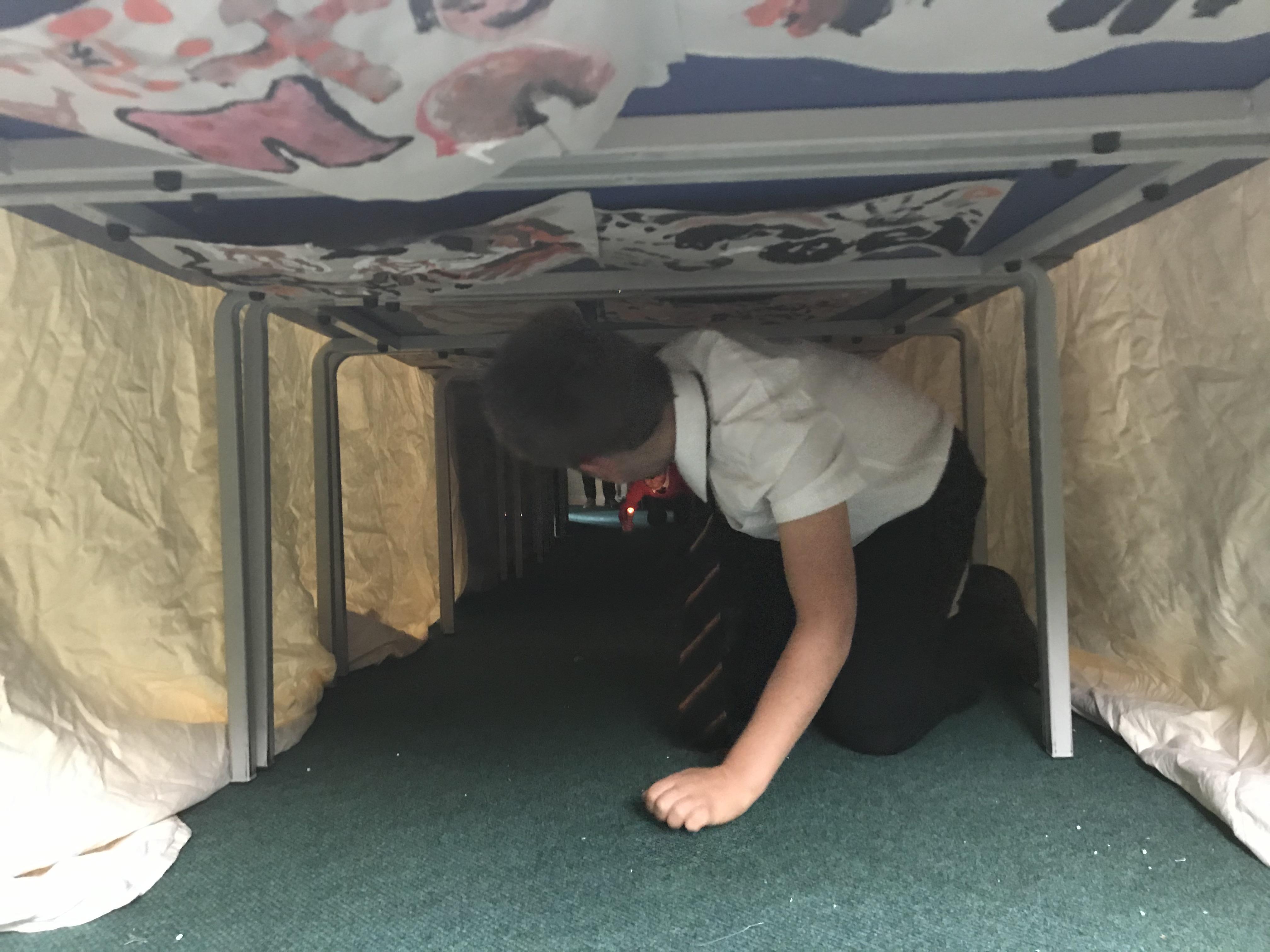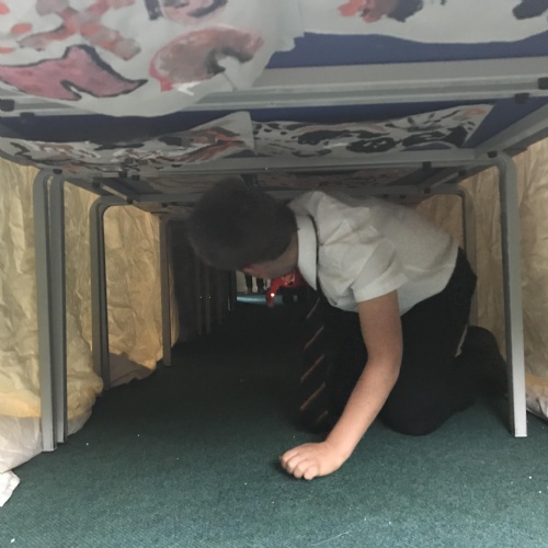 SO.... we made a camp fire, built shelter and hunted animals in the Outdoor area, researched how to make weapons, designed and sewed Stone Age tunics, created Cave art on the table walls and created caves in the classroom. We've had so much fun! We then invited the whole school (one class at a time, obviously!) into our classroom, which had been transformed into a huge cave! Year 5 taught everyone, from EYFS all the way up to Year 6, all about what they had learnt so far. To top it all off, we gave them torches and instructions to carefully venture through the long, dark cave back into 2019!
